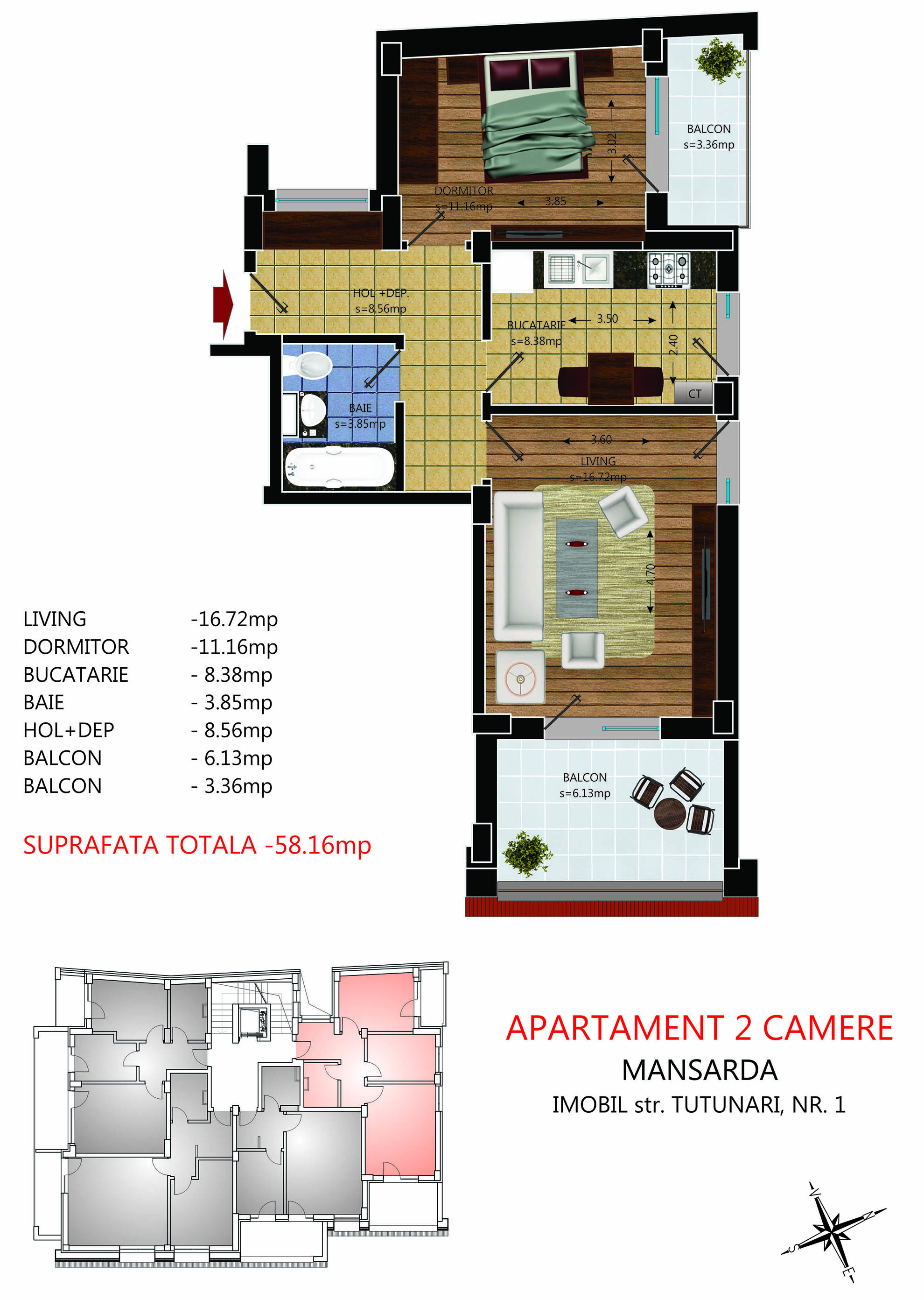 Apartament 2 Camere Mansarda 58.16 mp
